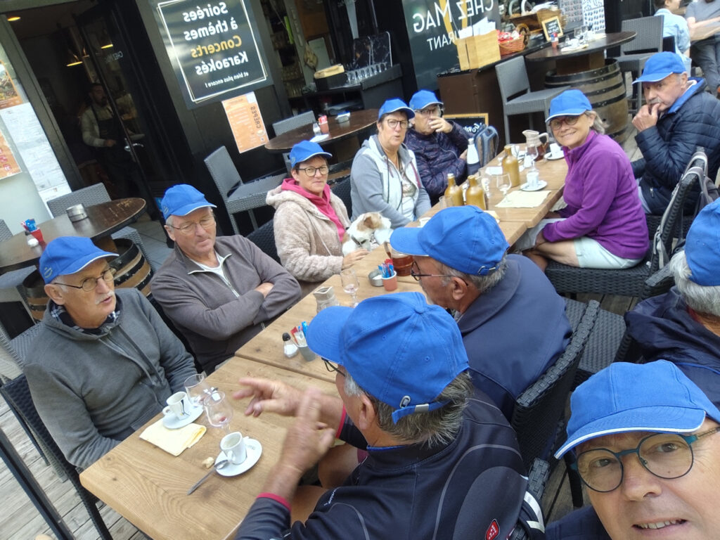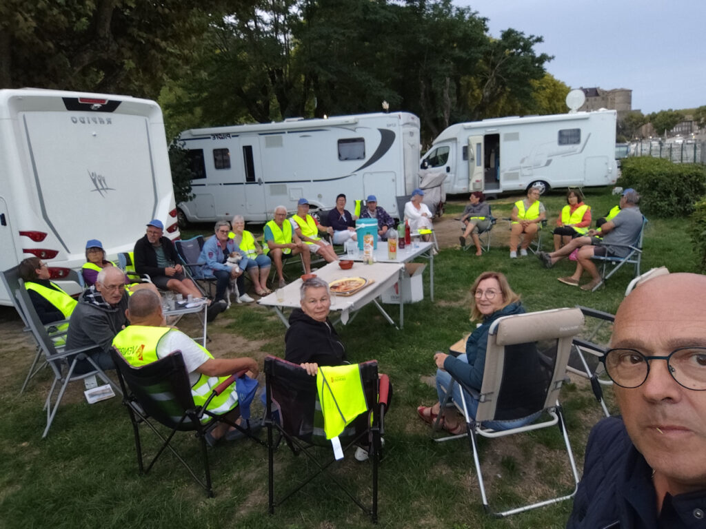 à midi déjeuner en terrasse entre amis, et retour aux camping-cars.